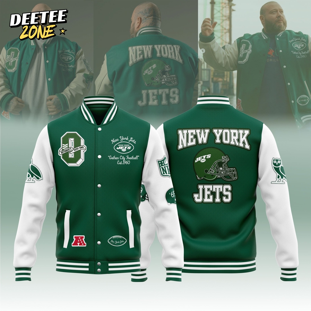 The New York Jets OVO Full-Snap Varsity Jacket Bomber Jacket is the ultimate blend of style and team spirit. Perfect for game days or casual outings, this baseball jacket features premium materials and a sleek design that showcases your Jets pride. With its comfortable fit and iconic branding, wearing this jacket makes you stand out. Elevate your wardrobe with the New York Jets OVO Full-Snap Varsity Jacket Bomber Jacket today!